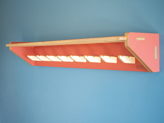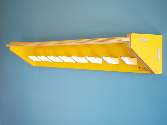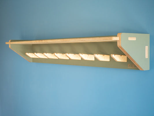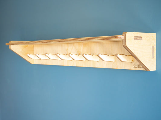 Mr Just Right is 900mm wide with the same depth as the other smaller members of the SHELFIE family. He has eight double notched hooks, and he can comfortably accommodate four helmets on the ventilated shelf. Perfect for fitting into the family spaces in your home when The Big Guy is just a little too big.