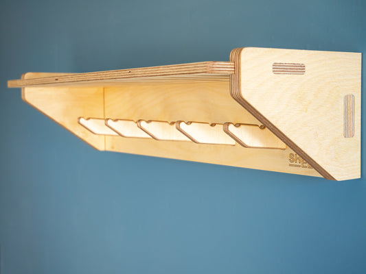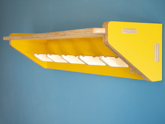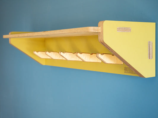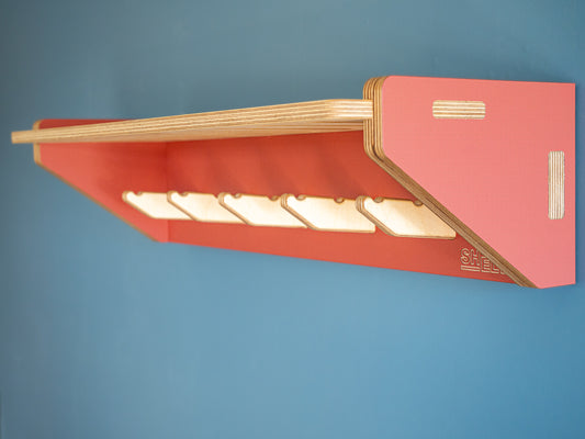 The Little Chaos Saver is 600mm wide with the same depth as the other smaller members of the SHELFIE family. She has five double notched hooks, and she can comfortably accommodate two helmets on the ventilated shelf. Perfect for fitting into kids rooms to get the school bags off the ground and the jackets hung up.