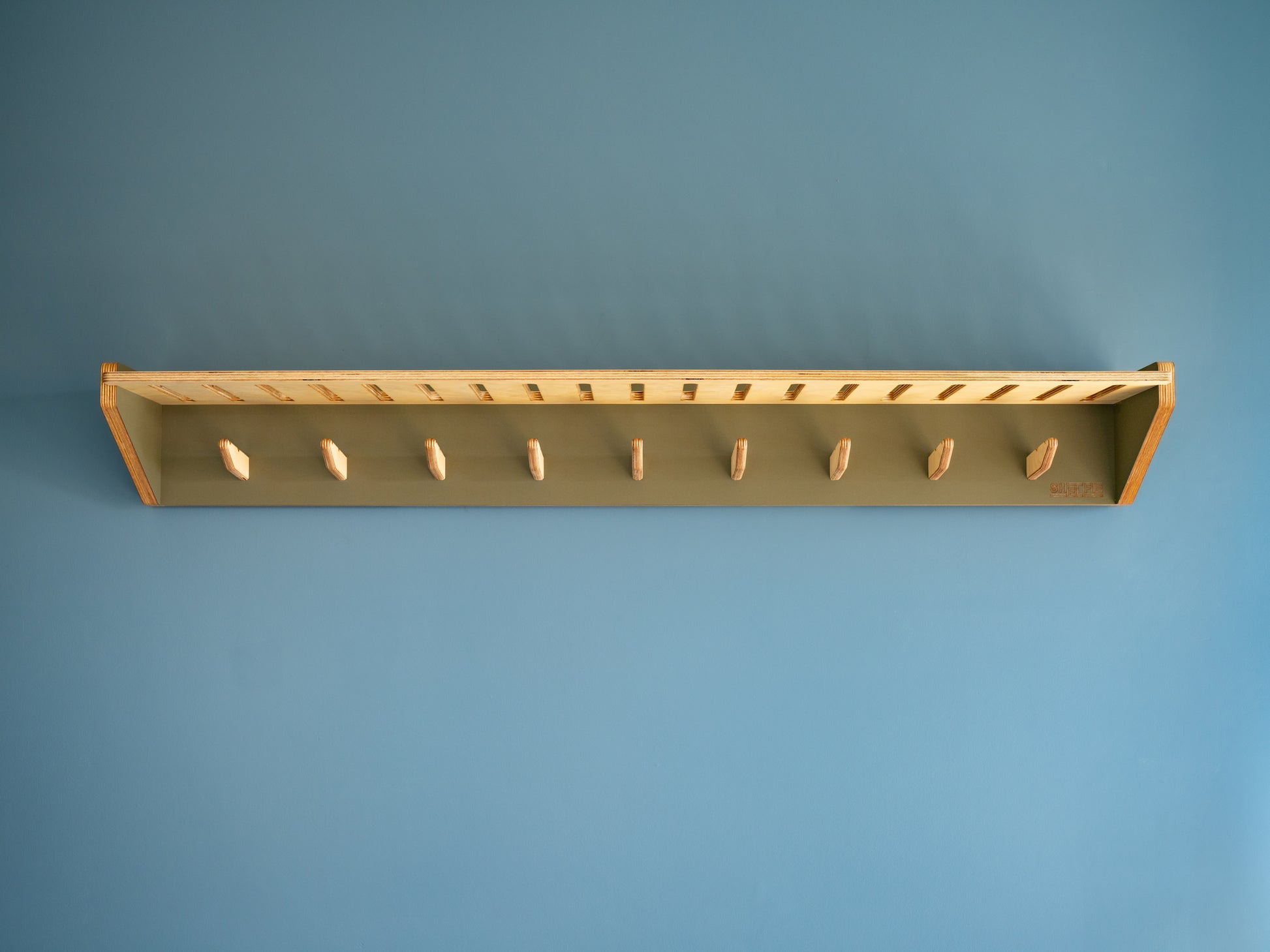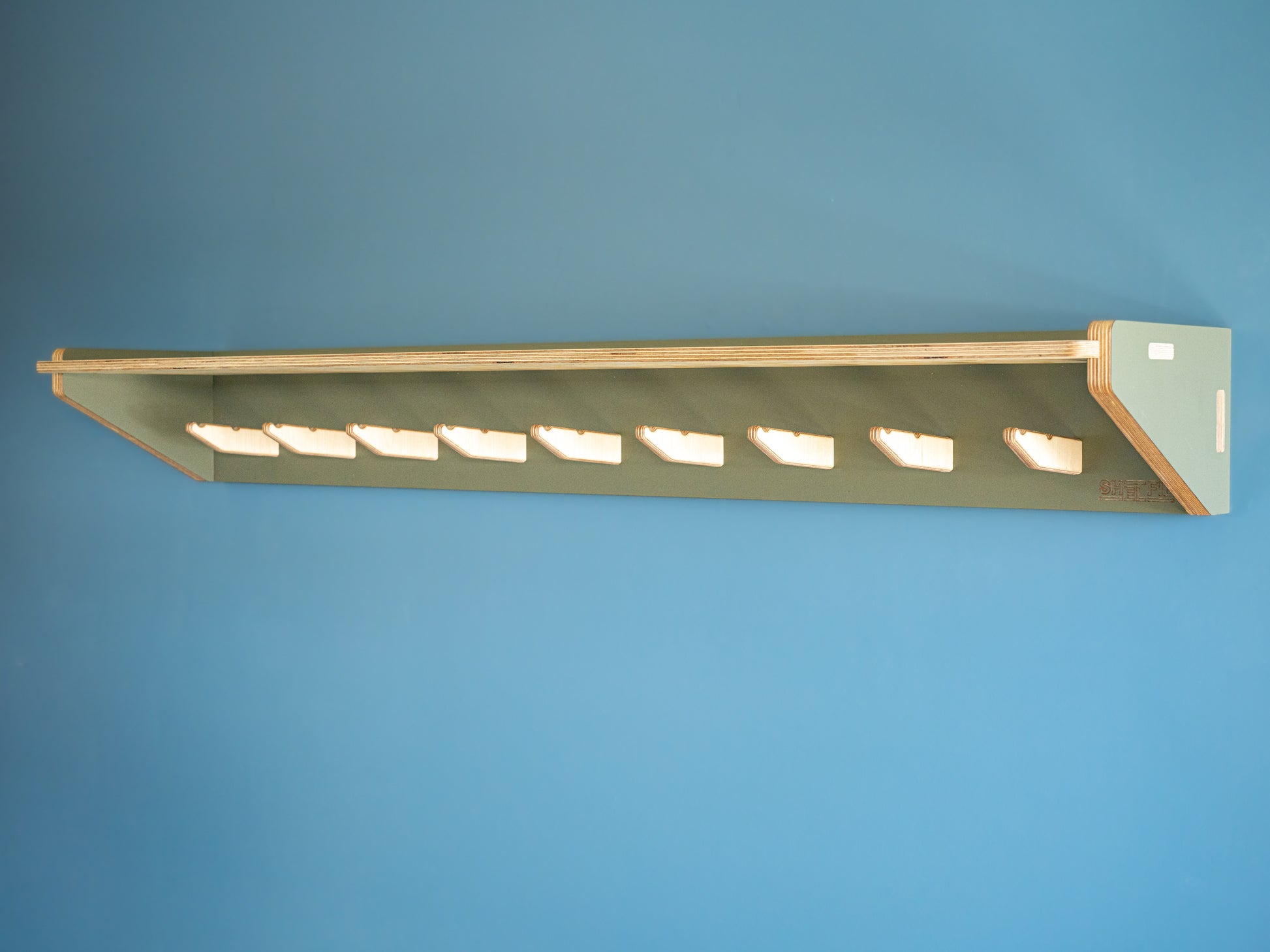Coloured sides and back in stunning Kea Matt-finish laminate. Shelf and Hooks are natural Birch. All exposed timber edges and faces finished with The Natural Paint Companies Danish Oil.