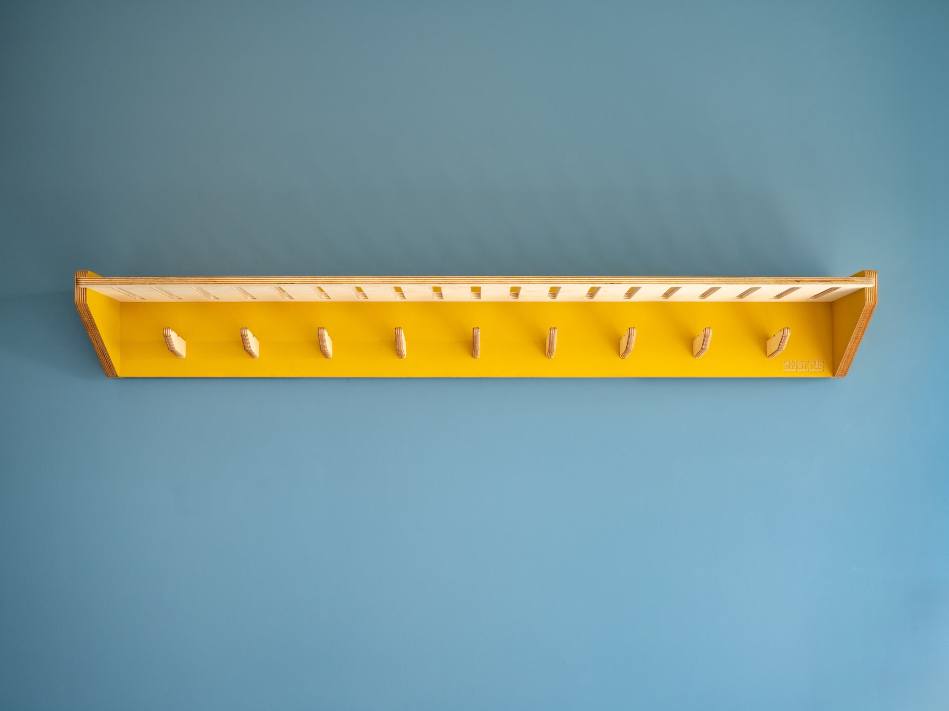 Coloured sides and back in stunning Kōwhai Matt-finish laminate. Shelf and Hooks are natural Birch. All exposed timber edges and faces finished with The Natural Paint Companies Danish Oil.