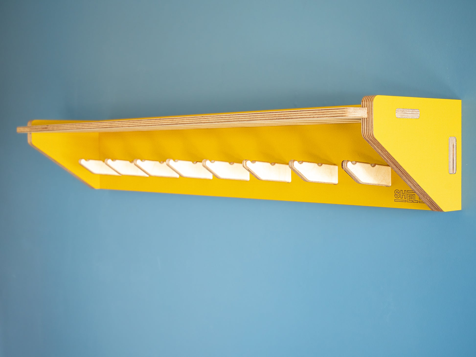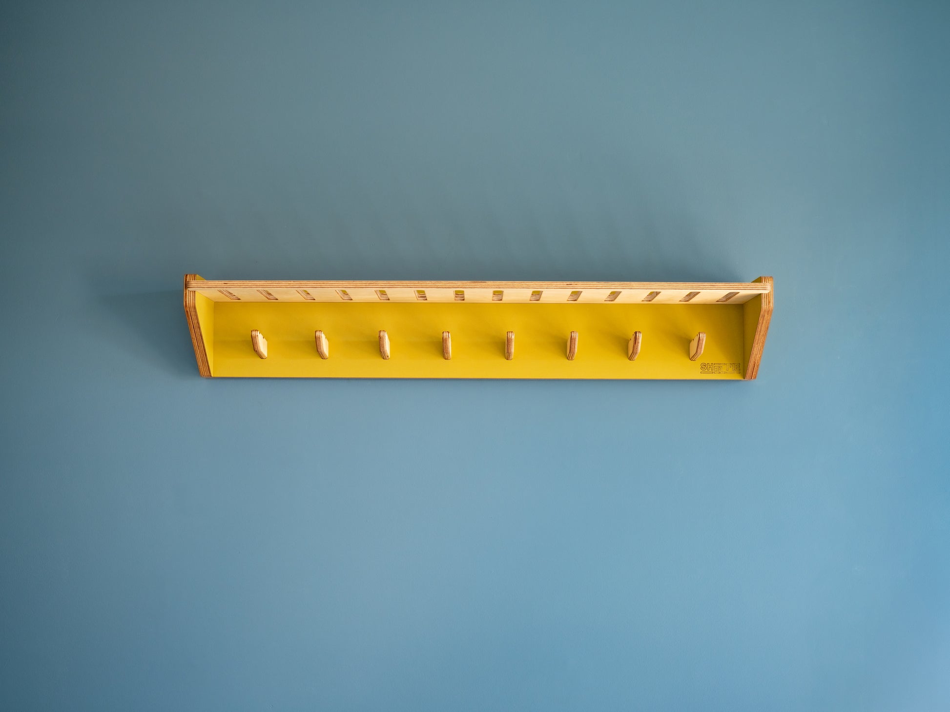Coloured sides and back in stunning Kōwhai Matt-finish laminate. Shelf and Hooks are natural Birch. All exposed timber edges and faces finished with The Natural Paint Companies Danish Oil.