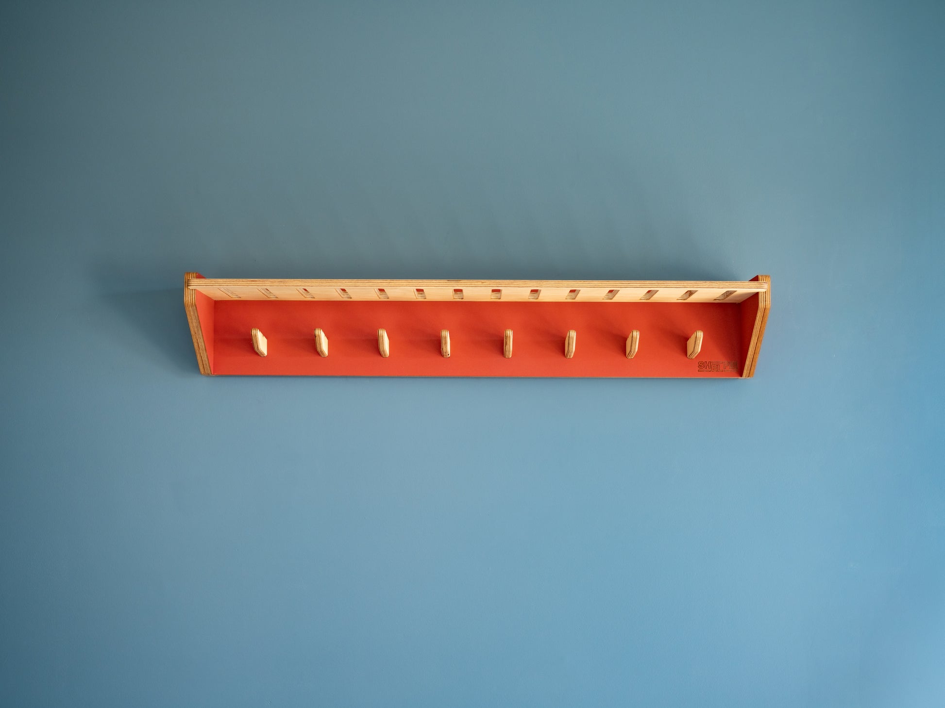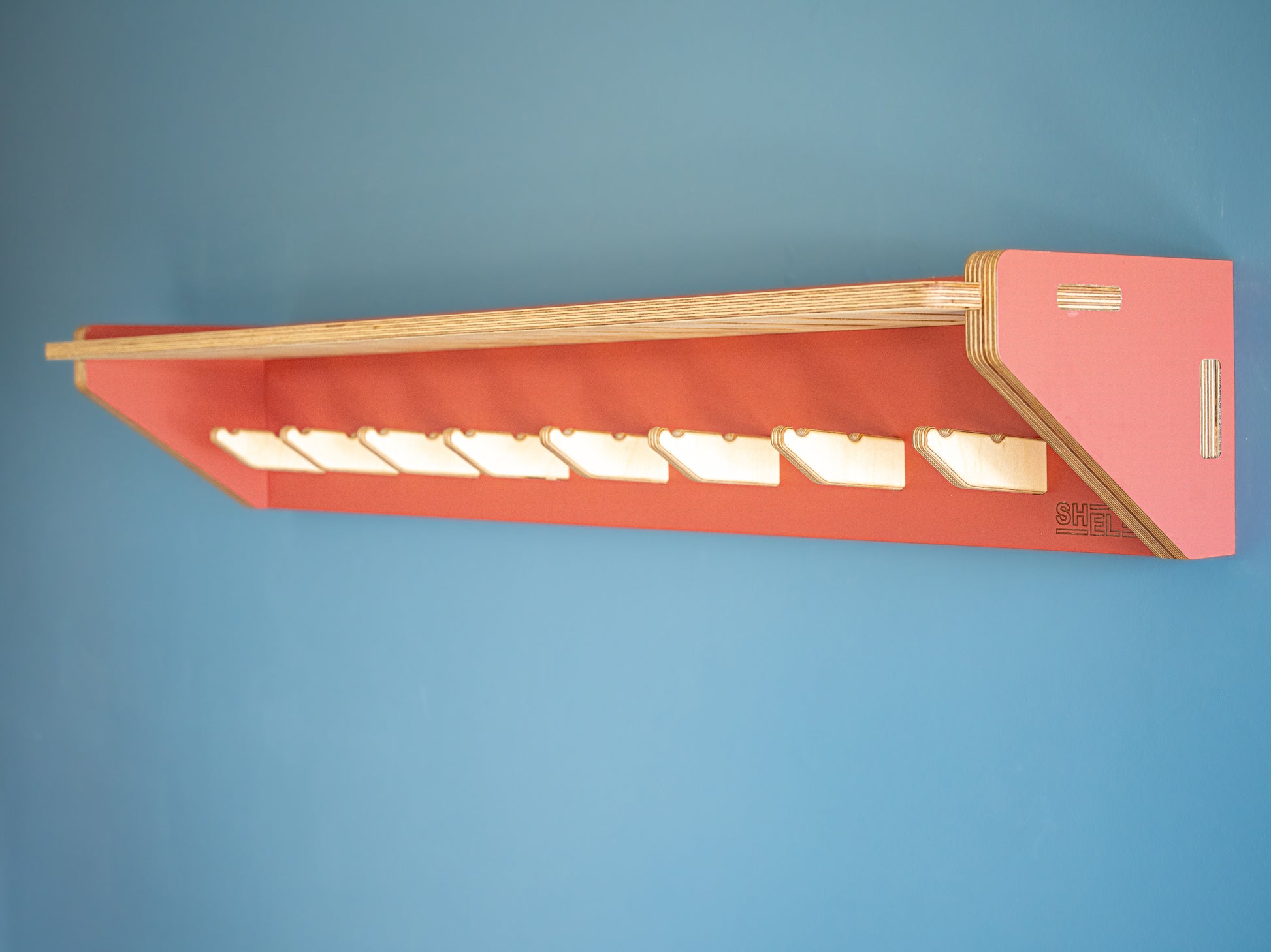 Coloured sides and back in stunning Pōhutukawa Matt-finish laminate. Shelf and Hooks are natural Birch. All exposed timber edges and faces finished with The Natural Paint Companies Danish Oil.