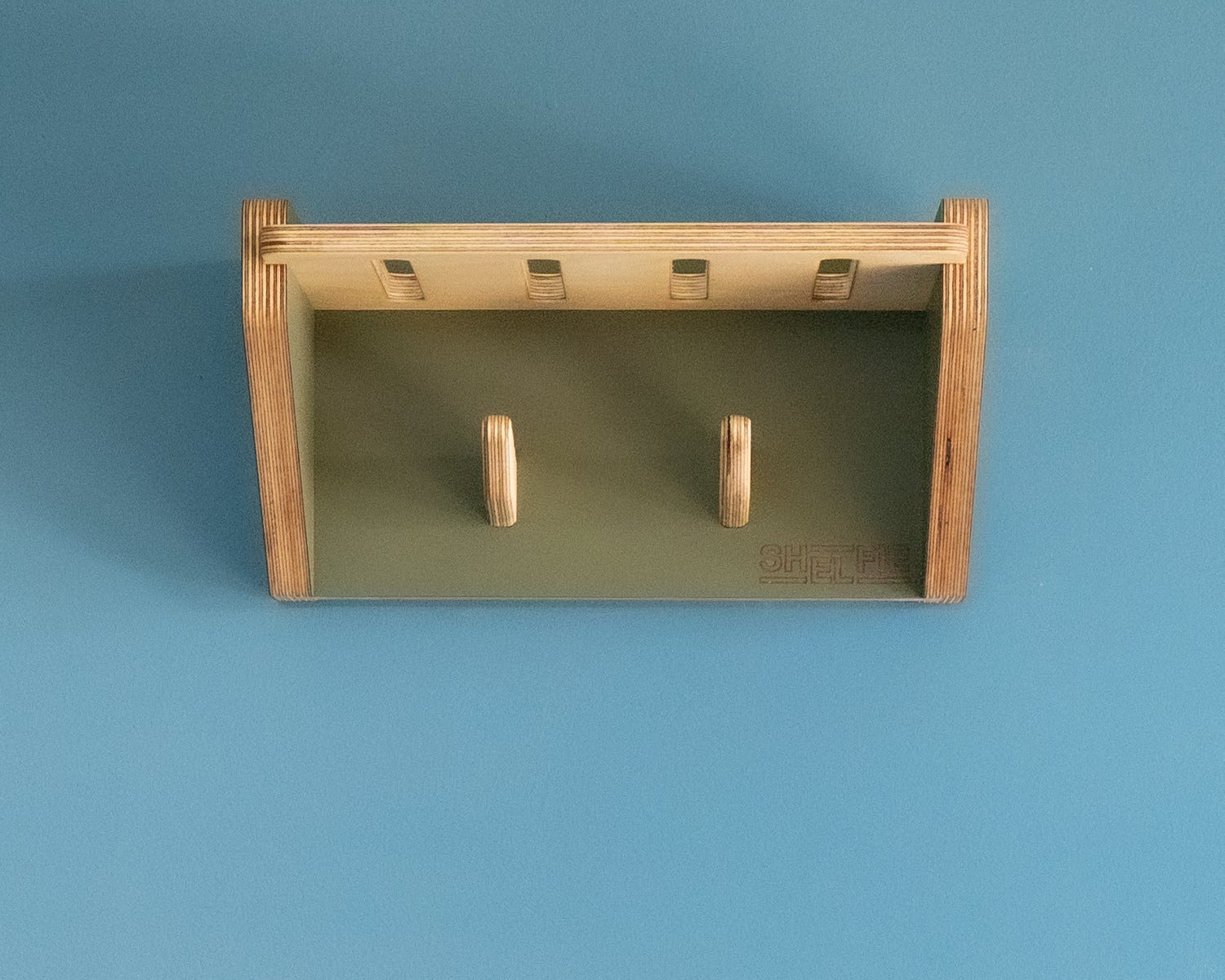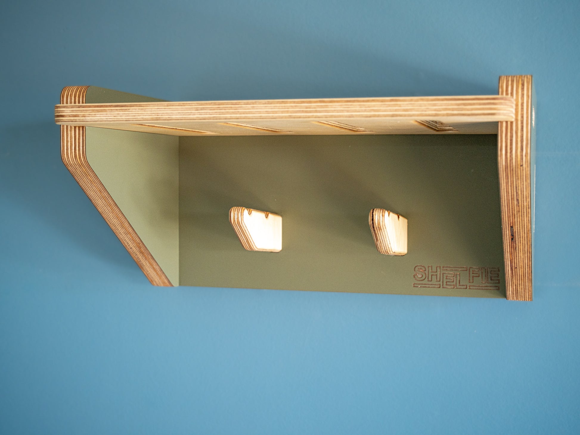 Coloured sides and back in stunning Kea Matt-finish laminate. Shelf and Hooks are natural Birch. All exposed timber edges and faces finished with The Natural Paint Companies Danish Oil.