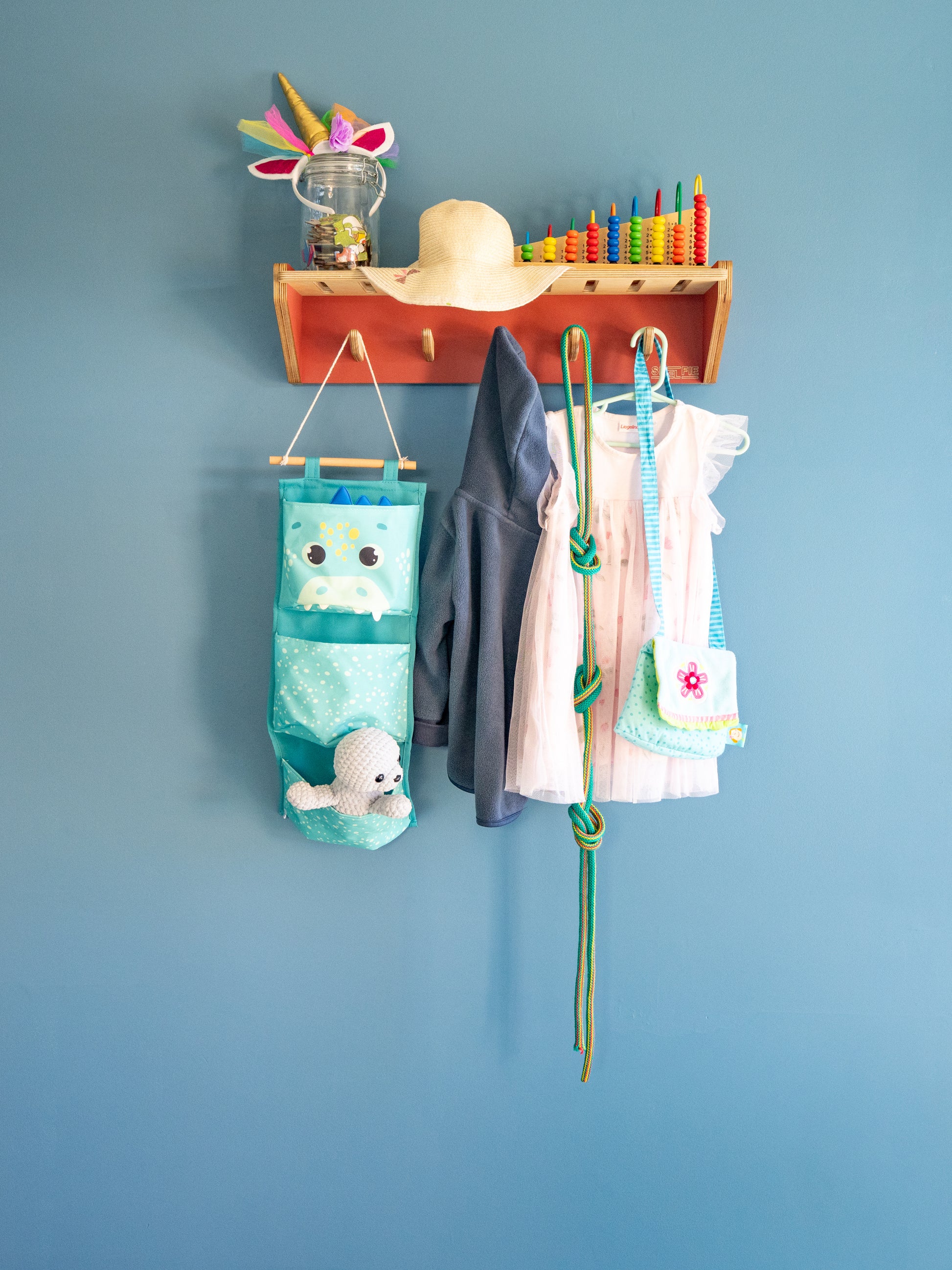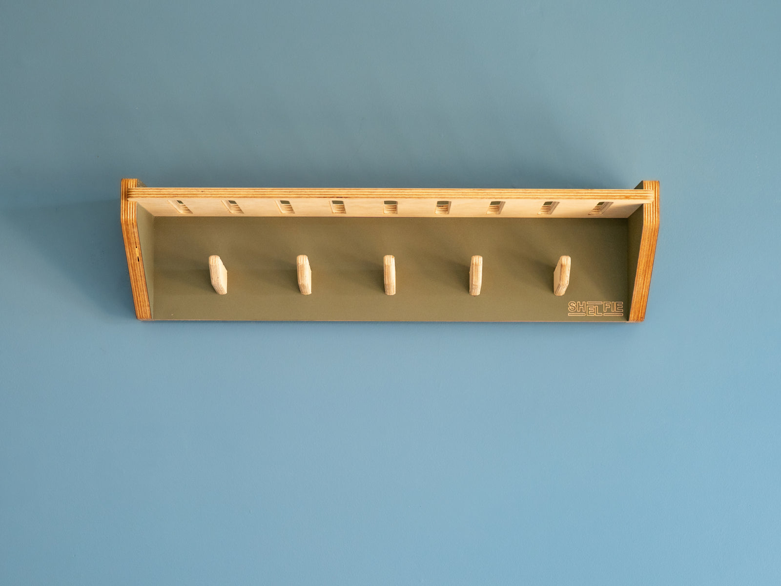Coloured sides and back in stunning Kea Matt-finish laminate. Shelf and Hooks are natural Birch. All exposed timber edges and faces finished with The Natural Paint Companies Danish Oil.