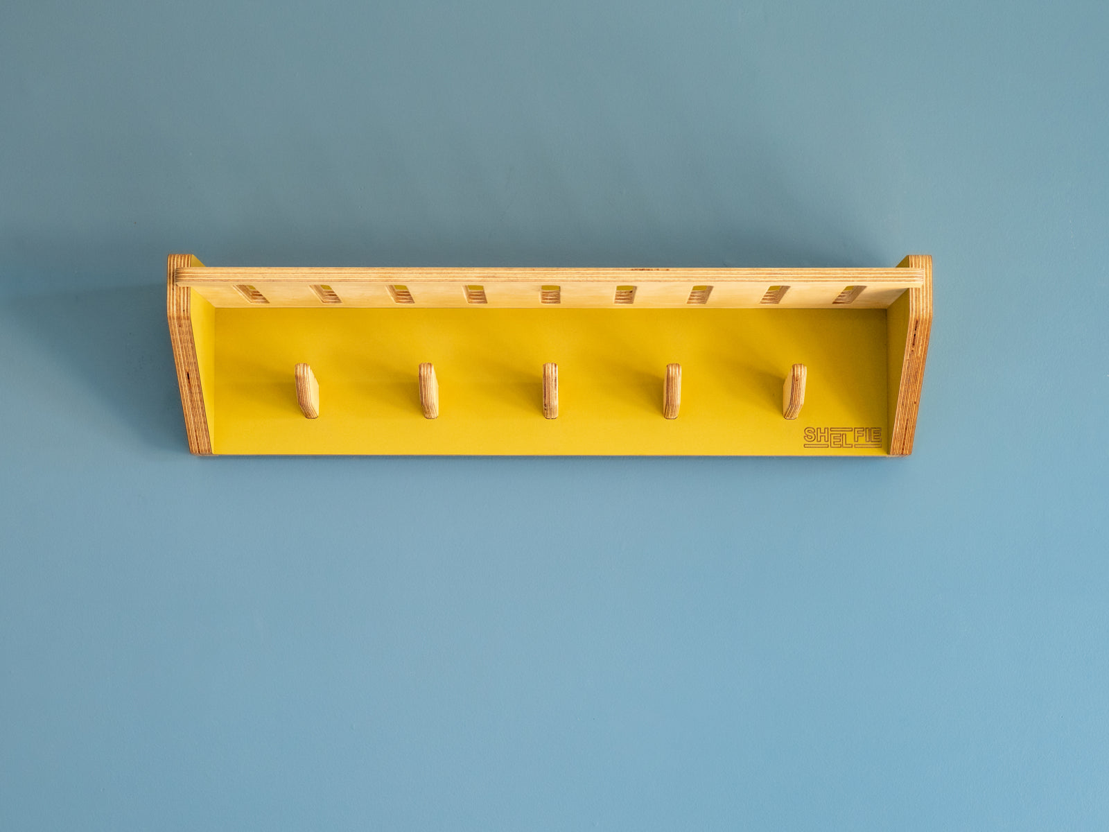 Coloured sides and back in stunning Koru Matt-finish laminate. Shelf and Hooks are natural Birch. All exposed timber edges and faces finished with The Natural Paint Companies Danish Oil.
