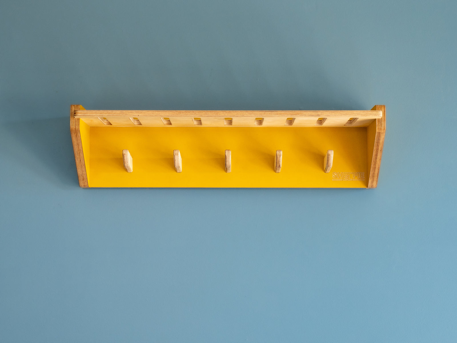 Coloured sides and back in stunning Kōwhai Matt-finish laminate. Shelf and Hooks are natural Birch. All exposed timber edges and faces finished with The Natural Paint Companies Danish Oil.